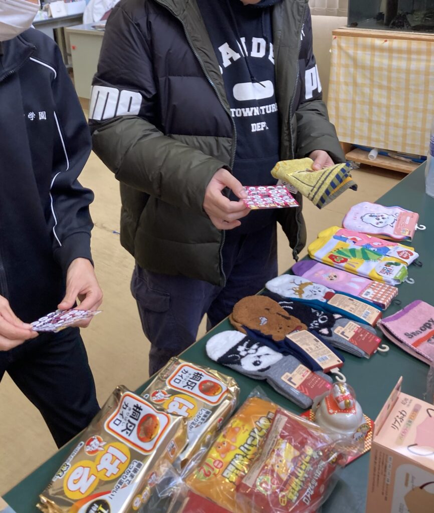 クリスマスのお楽しみはビンゴ大会です。洋服やコップ、日用品など目移りしますね。